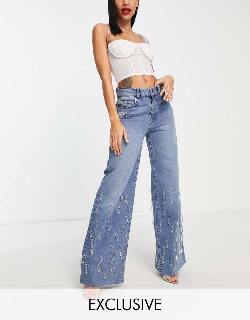ASYOU Jeans dritti extra lunghi blu con cristalli pendenti